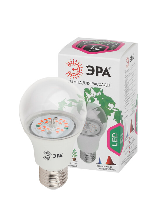 Лампа ЭРА FITO-14W-RB-E27-K мощностью 14 Вт лучший помощник для домашних растений. Вы сможете озеленить свое пространство на кухне, балконе или подоконнике. Оптимальное расстояние до листьев 10-15 см. Важно: расположение на высоте более 40 см не дает должного эффекта при выращивании для любой фитолампы аналогичной мощности.Красно-синий спектр активизирует процесс фотосинтеза и работу хлорофиллов, помогает укрепить корневую систему, ускоряет темпы выработки глюкозосодержащих веществ. Прозрачный рассеиватель лампы увеличивает эффективность эксплуатации почти вдвое по сравнению с матовым рассеивателем. Эффективная площадь выращивания около полуметра.Фитосветильник не представляет угрозы для глаз животных и человека. Приятный розовый оттенок с отсутствием пульсаций не будет давить на глаза. Лампа оснащена эффективными светодиодами, поэтому ее нагрев минимален.Розовая лампа подойдет как для взрослых растений, так и для рассады. Идеальна для выращивания помидоров, баклажанов, перцев. Возможна эксплуатация даже при отсутствии естественных источников излучения для этих культур.Обеспечьте себя богатым урожаем вместе с фитолампой для растений ЭРА.