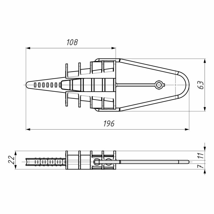 Предназначен для анкерного крепления 2-жильного провода СИП-4 ответвлений сечением 16-25 мм2 от магистрали к вводам. Зажим обеспечивает надежную фиксацию и удержание проводов путём натяжения при монтаже воздушных линий электропередач. Крепится на опорах или стенах с помощью крюков и кронштейнов. Установка зажима производится благодаря наличию скобы. Изготовлен из диэлектрического материала, выполняет изолирующую функцию. Подвижные клинья выполнены с особым рельефом, надежно фиксирующим проводник, не повреждая изоляцию. Скоба зажима съемная, для ее быстрой и надежной фиксации предусмотрено по два отверстия с каждой стороны. Зажим не требует монтажного инструмента. Обладает высокой прочностью, устойчивостью к ультрафиолету, коррозии, воздействию экстремальных температур, влажности и другим погодно-климатическим факторам.