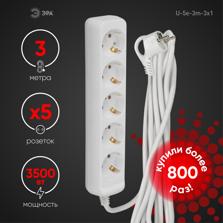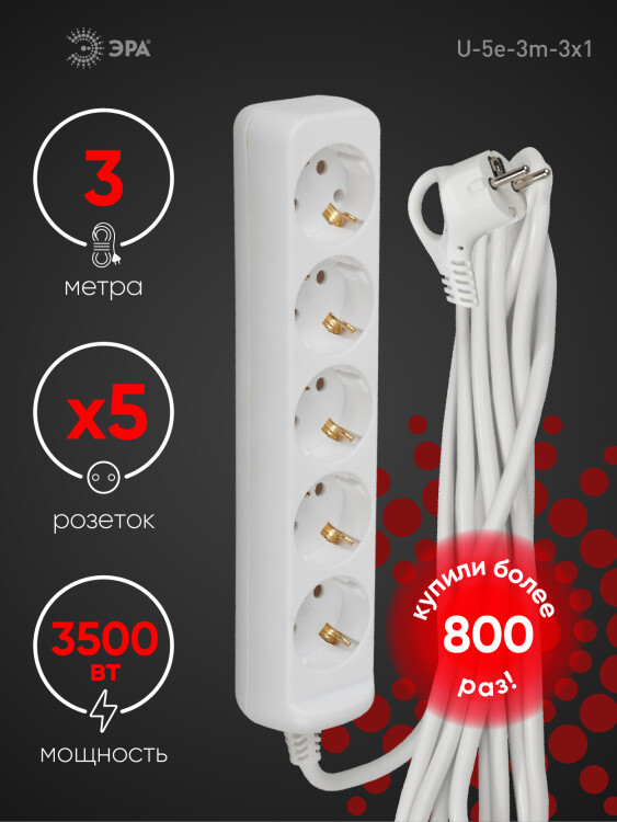 Удлинитель электрический Эра U-5e-3m-3x1 с заземлением, ПВС, 3x1мм2, 5 розеток, 3 м. Рассчитан на максимальную мощность 16А/3500 Вт. Удлинитель Эра станет Вашим надежным помощником, если Ваши любимые электроприборы находятся далеко от розеток. Провод в удлинителях Эра сделан из 100% меди, что делает его абсолютно пожаробезопасным. Корпус выполнен из ударопрочного и негорючего пластика (полипропилен). В моделях с заземлением у вилки есть кольцо для удобного извлечения из розетки. Модель удлинителя на 16А позволяет подключить мощные бытовые приборы общей нагрузкой до 3500Вт. Не бойтесь включить чайник, обогреватель, микроволновку или другие электроприборы. Толстый провод удлинителя Эра гарантирует полную безопасность. Дизайн удлинителя разработан в России командой Эра Style.