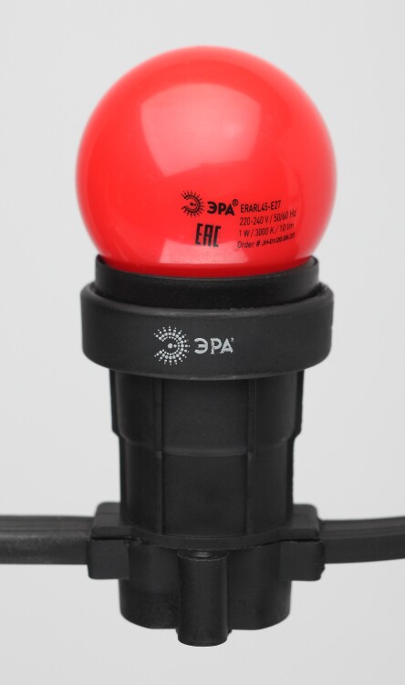Декоративная светодиодная лампа ЭРА "Белт-лайт" с цоколем Е27 и колбой шар (Р45) красного цвета. Мощность - 1 Вт. Идеально подходит для использования в уличной гирлянде-конструкторе ЭРА "Белт-лайт", дающей возможность самостоятельного дизайна и монтажа праздничной иллюминации. В составе гирлянды-конструктора позволяет создавать уникальное праздничное освещение по индивидуальным параметрам и для конкретных задач. Вы сами выбираете длину подсветки, цвет ламп и расстояние между источниками света. Это идеальное решение для декора фасадов зданий, оформления витрин, общественных пространств на свежем воздухе. Другие элементы гирлянды-конструктора: патрон Б0049176, кабель Б0049175, набор для подключения (шнур питания с вилкой + коннектор) Б0049180, коннектор Б0049179, заглушка Б0049181, заглушка с крюком Б0049182. В ассортименте ЭРА LED-лампы "Белт-лайт" E27 разных цветов, в том числе прозрачные и матовые белые. Колбы изготовлены из лёгкого ударопрочного пластика, такие лампы удобно транспортировать, использовать и хранить. Цоколь - из алюминия. Лампы ЭРА "Белт-лайт" универсальны: подходят к любому светотехническому прибору с патроном для Е27. Создают необычное цветное свечение определённого оттенка. Помогают воплощать в жизнь смелые дизайнерские идеи.