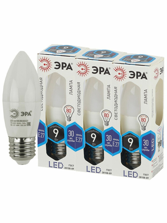 ЭРА Лампа светодиодная STD LED B35-9W-840-E27 9Вт свеча нейтральный белый свeт Е27