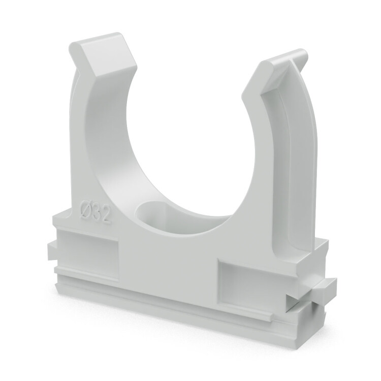 Предназначена для крепления гладких труб ПВХ или гофрированных труб одного диаметра к поверхности стен, потолков, полов или перегородок. Для монтажа предусмотрено технологическое отверстие под дюбель или саморез. Для удобства блочного монтажа состыковываются друг с другом с помощью специальных фиксаторов типа «ласточкин хвост».