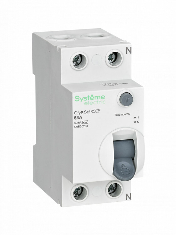 Выключатель дифференциального тока (ВДТ) и ли устройство защитного отключения (УЗО) серии City9 Set Systeme Electric, 2-полюсный, номинальный ток 63А, ток утечки 30 мА, тип АС, электромеханический. Применяется в электрических сетях напряжением 230В. Уставка по току утечки 30 мА обеспечивает гарантированную защиту людей при прямом и косвенном прикосновении. Кнопка тест обеспечивает проверку работоспособности аппарата. Крепление на DIN-рейку шириной 35 мм. Подключение сверху и снизу. Безопасные клеммы (ранее Schneider Electric EZ9R34263).
