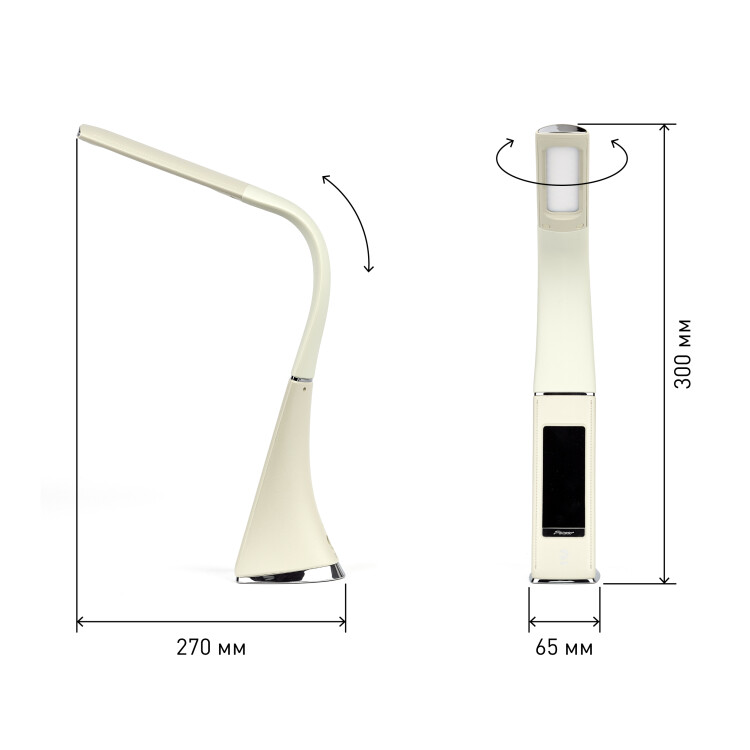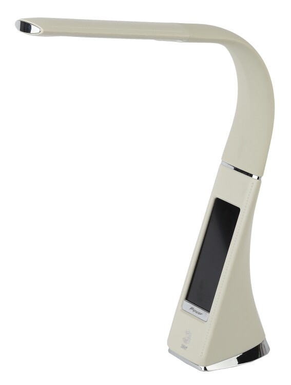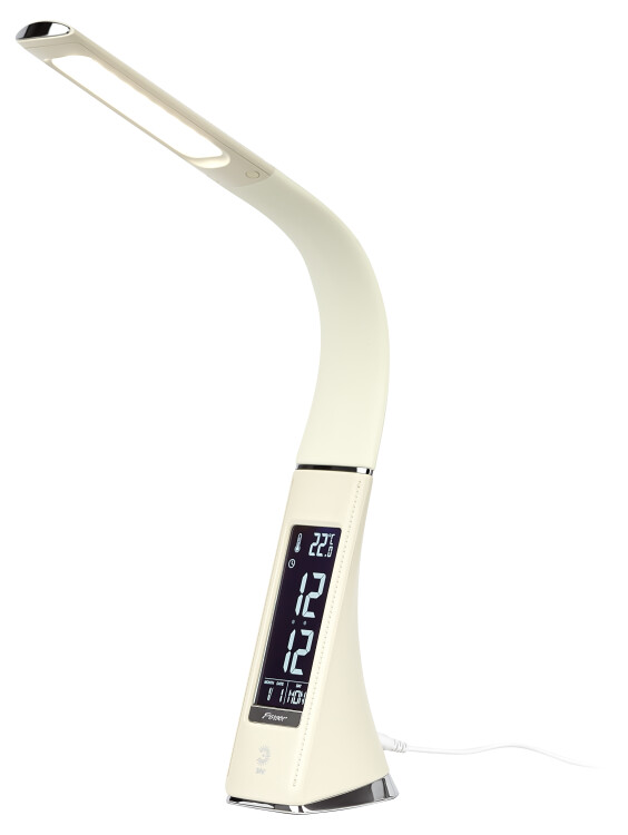 Настольный светильник ЭРА NLED-461-7W-BG со светод иодами (LED) в качестве источников света в дизайне "под кожу". Оснащен сенсорным управлением, есть регулировки яркости освещения - 3 уровня. Главное преимущество светильника - ЖК дисплей с функциями часов, будильника, календаря и термометра. Сенсорная кнопка с обратной стороны стойки обеспечивает опцию выбора яркости дисплея с возможностью его выключения. Высота плафона регулируется гибкой стойкой, направление света регулируется поворотом плафона в любом направлении.