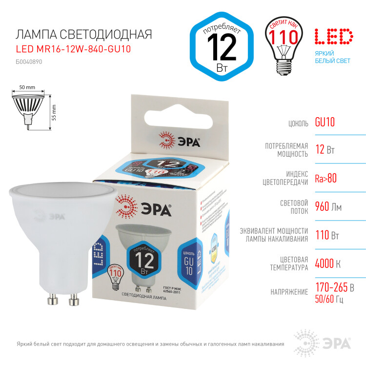 ЭРА Лампа светодиодная STD LED MR16-12W-840-GU10 12Вт софит нейтральный белый свет GU10