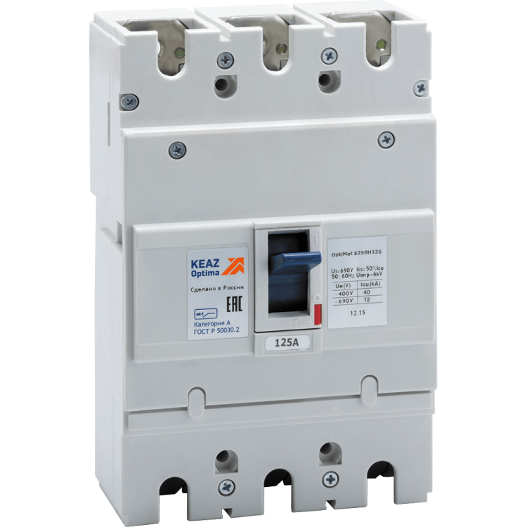 Блочный автоматический 3 полюсный выключ атель переменного тока с предельной коммутационной способностью при переменном токе 40 кА на номинальный ток 125 А .