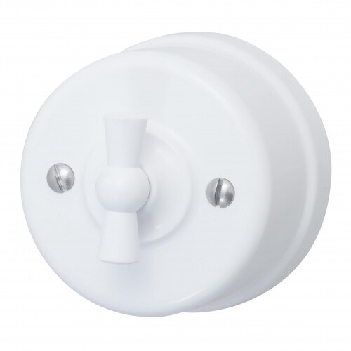 Изготовлен из высокопрочного пластика, устойчивого к истиранию. Оснащен поворотным переключателем вместо клавиши. Применяется с открытой проводкой, хорошо сочетается с текстильным кабелем. При необходимости может использоваться и при монтаже скрытой электропроводки.