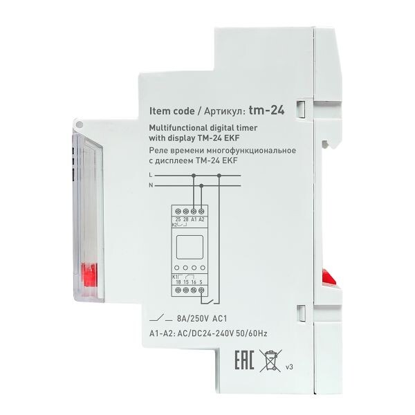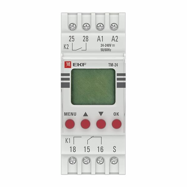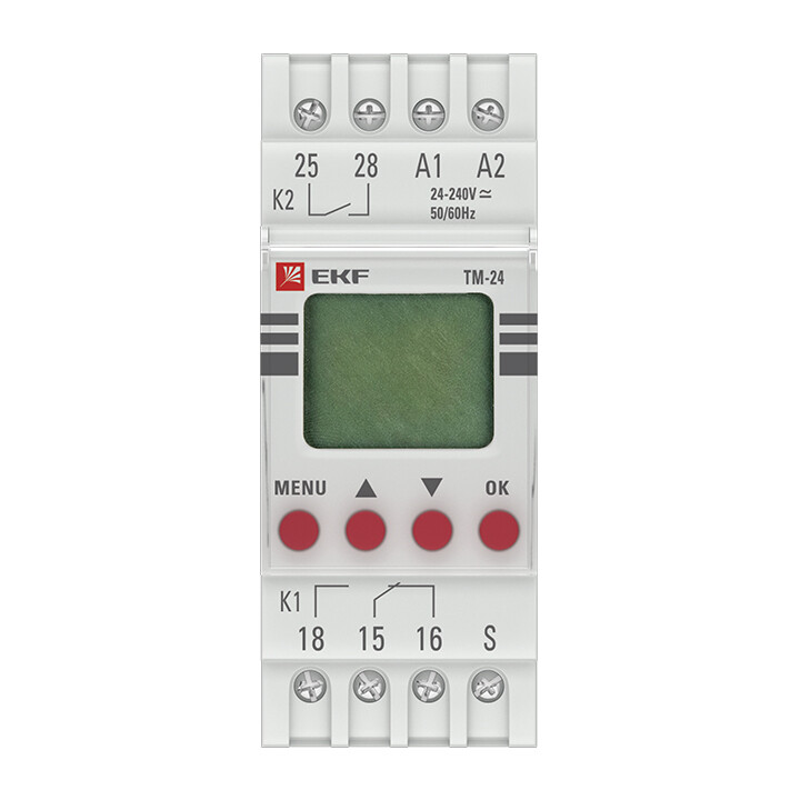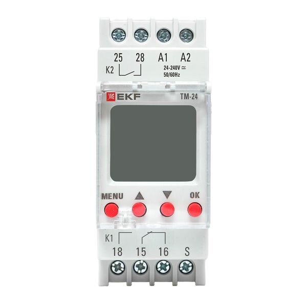 Реле времени многофункциональное с дисплеем ТМ-24 EKF PROxima представляет собой реле с двумя независимыми группами контактов, момент срабатывания которых (включение/отключение) происходит по заданному времени t1 и t2 и выбранной функции (24 функции).