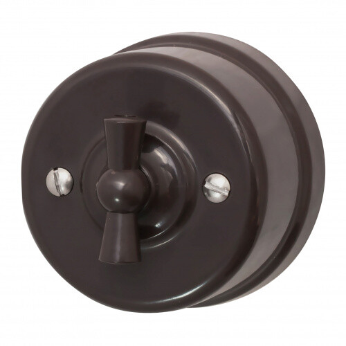 Изготовлен из высокопрочного пластика, устойчивого к истиранию. Оснащен поворотным переключателем вместо клавиши. Применяется с открытой проводкой, хорошо сочетается с текстильным кабелем. При необходимости может использоваться и при монтаже скрытой электропроводки.