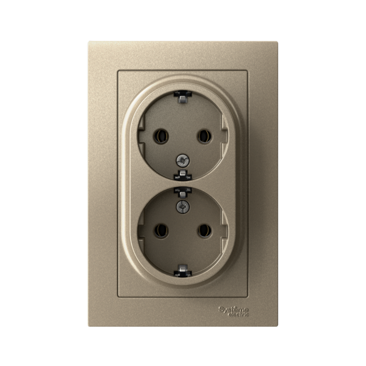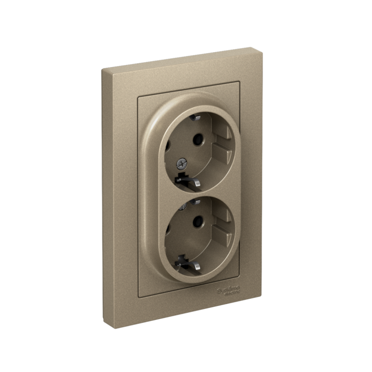 Розетка двойная в сборе Systeme Electric (ранее Schneider Electric) серии AtlasDesign в цвете шампань с заземлением, без шторок подходит для сетей 250 В, на ток 16 А. Заземляющий контакт обеспечивает дополнительную защиту от удара электрическим током. Лицевые детали из качественного ABS-пластика, устойчивого к царапинам и УФ-излучению. Двойная розетка позволяет подключить два устройства в одном месте. Изделие поставляется в комплекте с рамкой того же цвета.